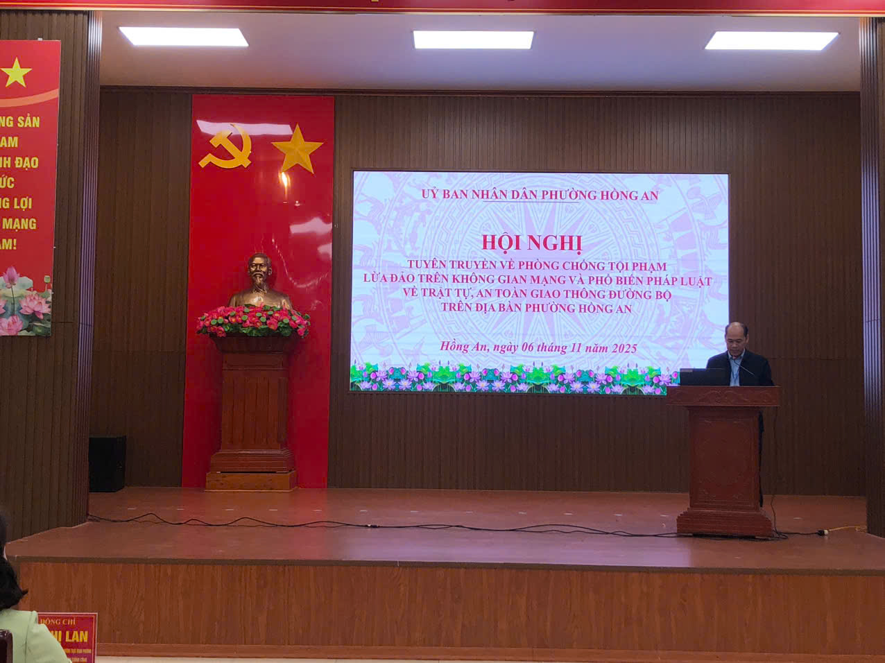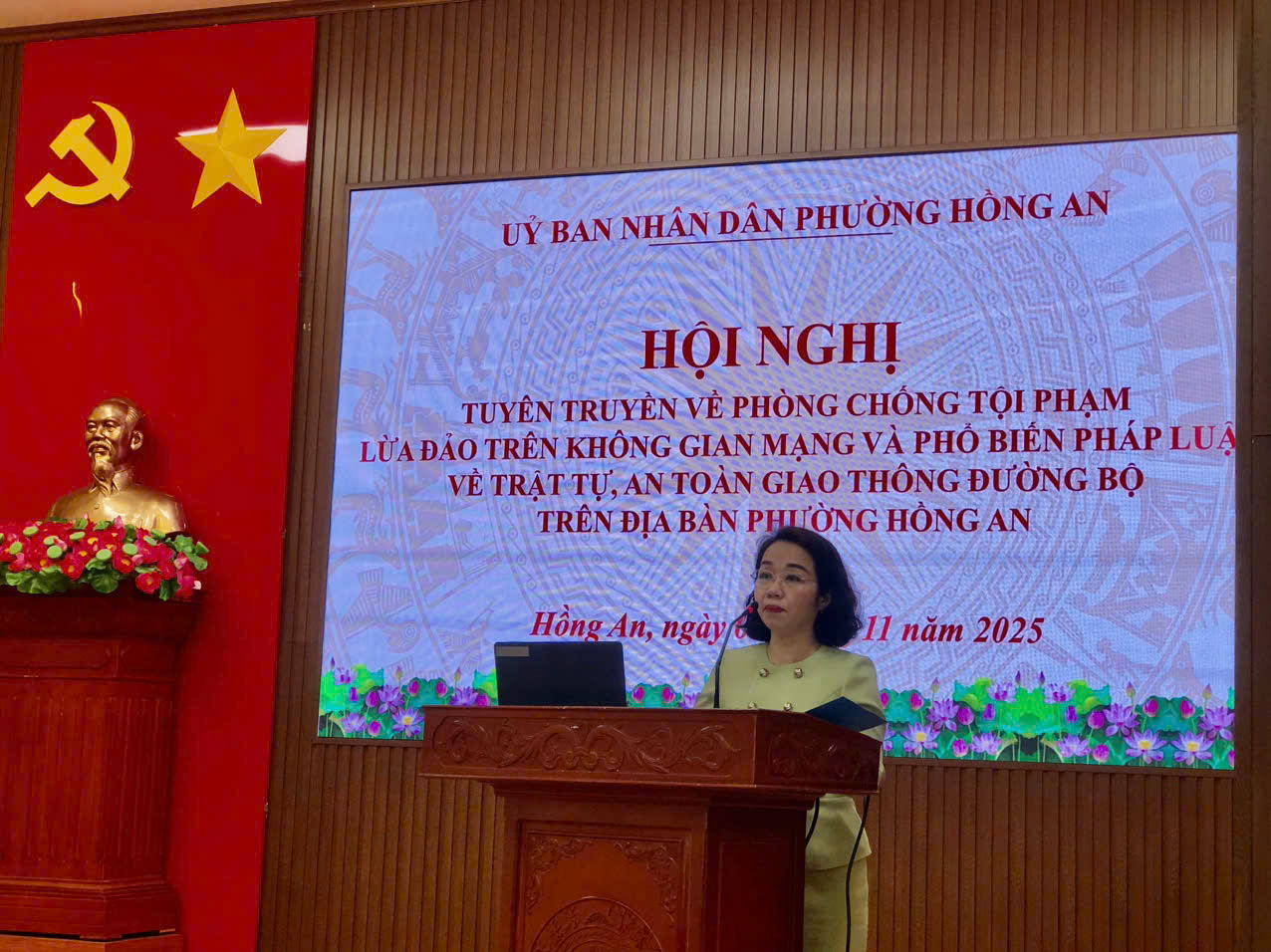 Thực hiện kế hoạch tổ chức các hoạt động hưởng ứng Ngày pháp luật Việt Nam, sáng ngày 06/11/2025, UBND phường Hồng An tổ chức Hội nghị tuyên truyền kiến thức pháp luật về phòng chống tội phạm lừa đảo trên không gian mạng và phổ biến Luật Trật tự, an toàn giao thông đường bộ trên địa bàn phường. Đồng chí Lê Thị Lan- Uỷ viên BTV Đảng uỷ, Phó Chủ tịch Thường trực UBND phường chủ trì Hội nghị. Dự Hội nghị có các đại biểu đại diện lãnh đạo MTTQ và các đoàn thể phường; cán bộ công chức các phòng chuyên môn, đơn vị thuộc phường; cán bộ, chiến sỹ công an phường, Ban chỉ huy quân sự phường; Bí thư Chi bộ, Tổ trưởng, Trưởng Ban công tác Mặt trận các tổ dân phố, tổ trưởng tổ bảo vệ an ninh trật tự tại cơ sở.