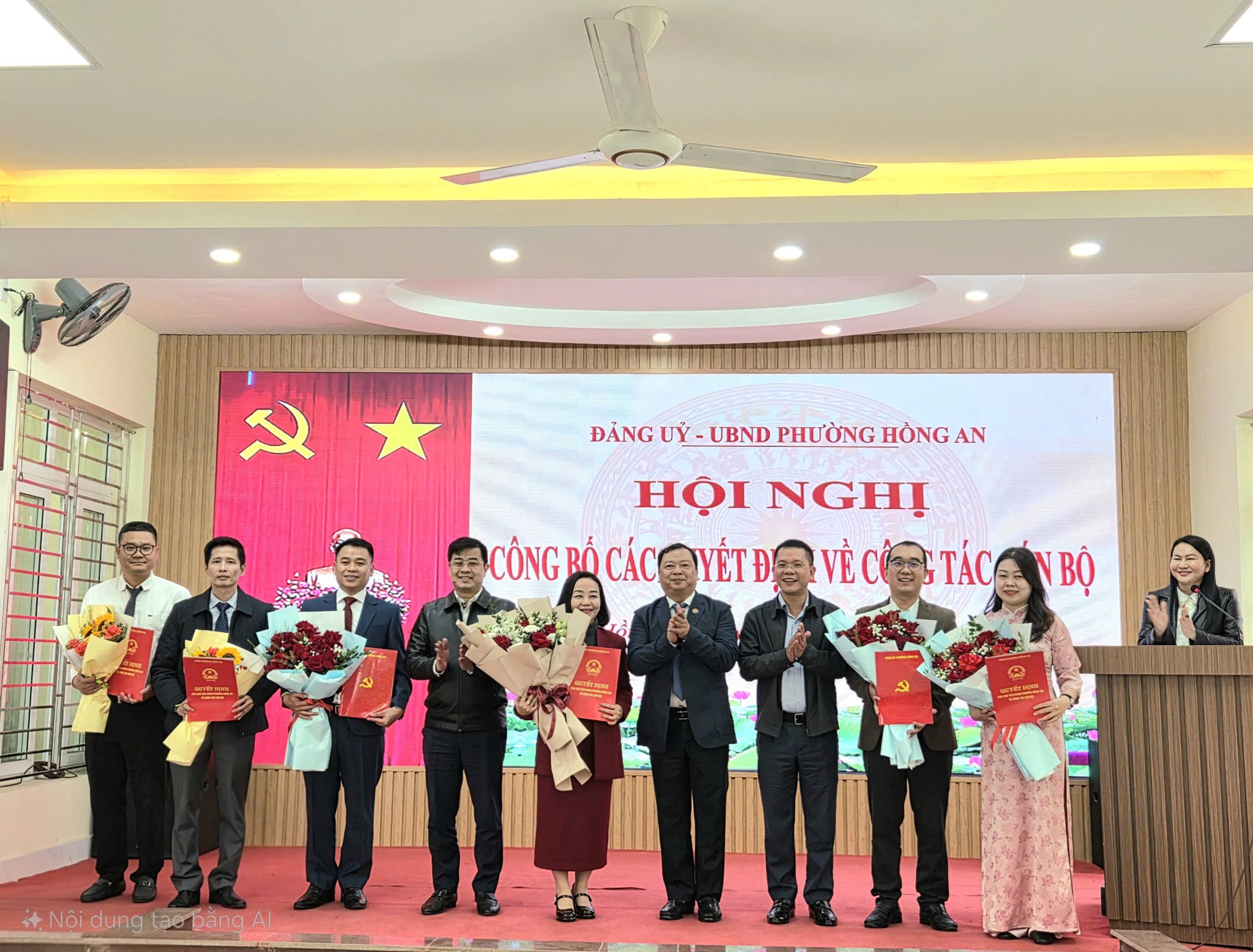 Thường trực Đảng uỷ trao Quyết định và tặng hoa chúc mừng các đồng chí được bổ nhiệmHội nghị đã công bố các quyết định của Đảng uỷ- UBND phường Hồng An về việc điều động, bổ nhiệm cán bộ; theo đó: