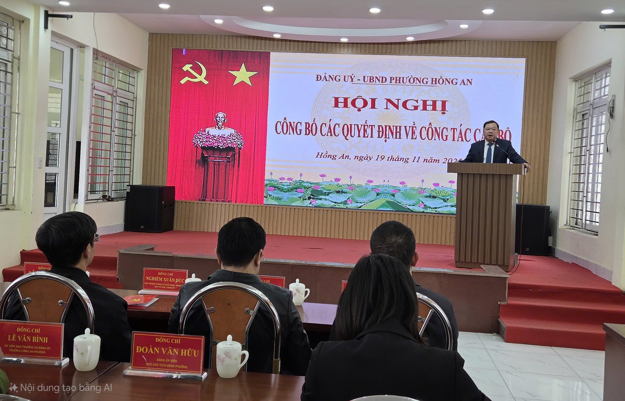 Ngày 19-11, Đảng uỷ - Ủy ban nhân dân phường Hồng An tổ chức Hội nghị công bố các quyết định về công tác cán bộ tại Ban Xây dựng Đảng Đảng uỷ, Trung tâm Phục vụ hành chính công, phòng Kinh tế, Hạ tầng và Đô thị phường. Dự Hội nghị có đồng chí Nghiêm Xuân Đức- Phó trưởng phòng Tổ chức đảng và đảng viên, Ban Tổ chức Thành uỷ. Về phía Đảng uỷ phường có đồng chí Đỗ Việt Hưng, Bí thư Đảng uỷ, Chủ tịch HĐND phường; đồng chí Nguyễn Hữu Thanh, Phó Bí thư Đảng uỷ, Chủ tịch UBND phường; đồng chí Lê Văn Mịch, Phó Bí thư Thường trực Đảng uỷ phường; các đồng chí Uỷ viên Ban Thường vụ Đảng uỷ; các cơ quan tham mưu, giúp việc Đảng ủy; phòng chuyên môn, đơn vị sự nghiệp thuộc UBND phường; các đồng chí cán bộ được điều động, bổ nhiệm.