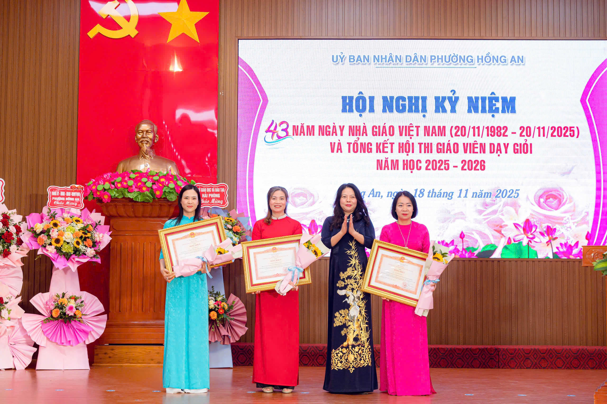 Đ/c Lê Thị Lan - Uỷ viên BTV Đảng uỷ, Phó Chủ tịch Thường trực UBND phường và đ/c Trần Thị Dung - ĐUV, Trưởng phòng Văn hoá - Xã hội trao Giấy chứng nhận cho 67 giáo viên dạy giỏi cấp phường năm học 2025 - 2026Cũng trong chương trình, Hội nghị đã công bố các Quyết định của Chủ tịch UBND phường về tổ chức Hội: Cho phép hợp nhất Hội Khuyến học các phường Quán Toan, An Hồng, An Hưng, Đại Bản (cũ) thành Hội Khuyến học phường Hồng An; Công nhận Ban vận động thành lập Hội Cựu giáo chức phường Hồng An. Việc kiện toàn các tổ chức hội góp phần tăng cường sức mạnh đoàn kết, huy động nguồn lực xã hội cho sự nghiệp giáo dục.