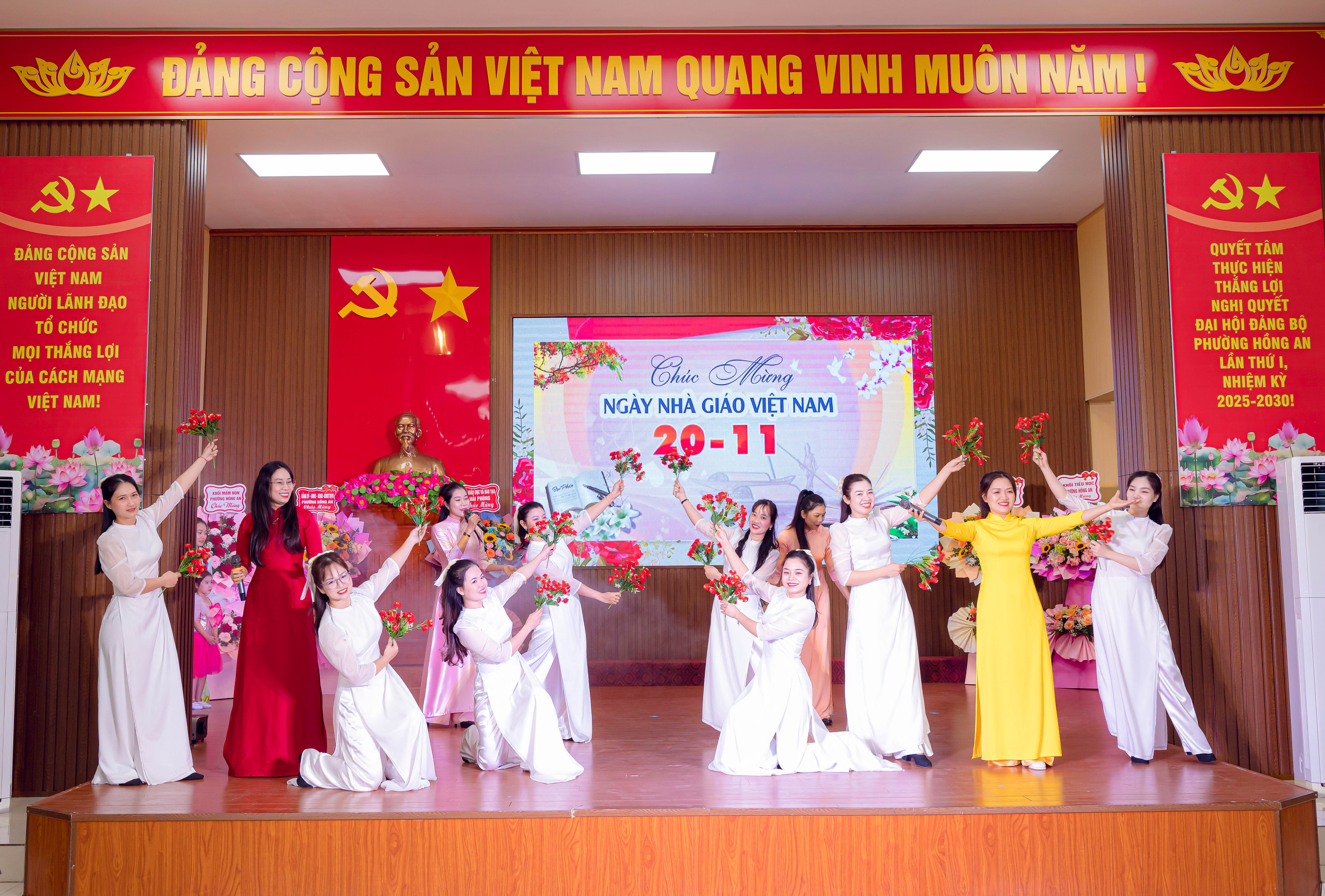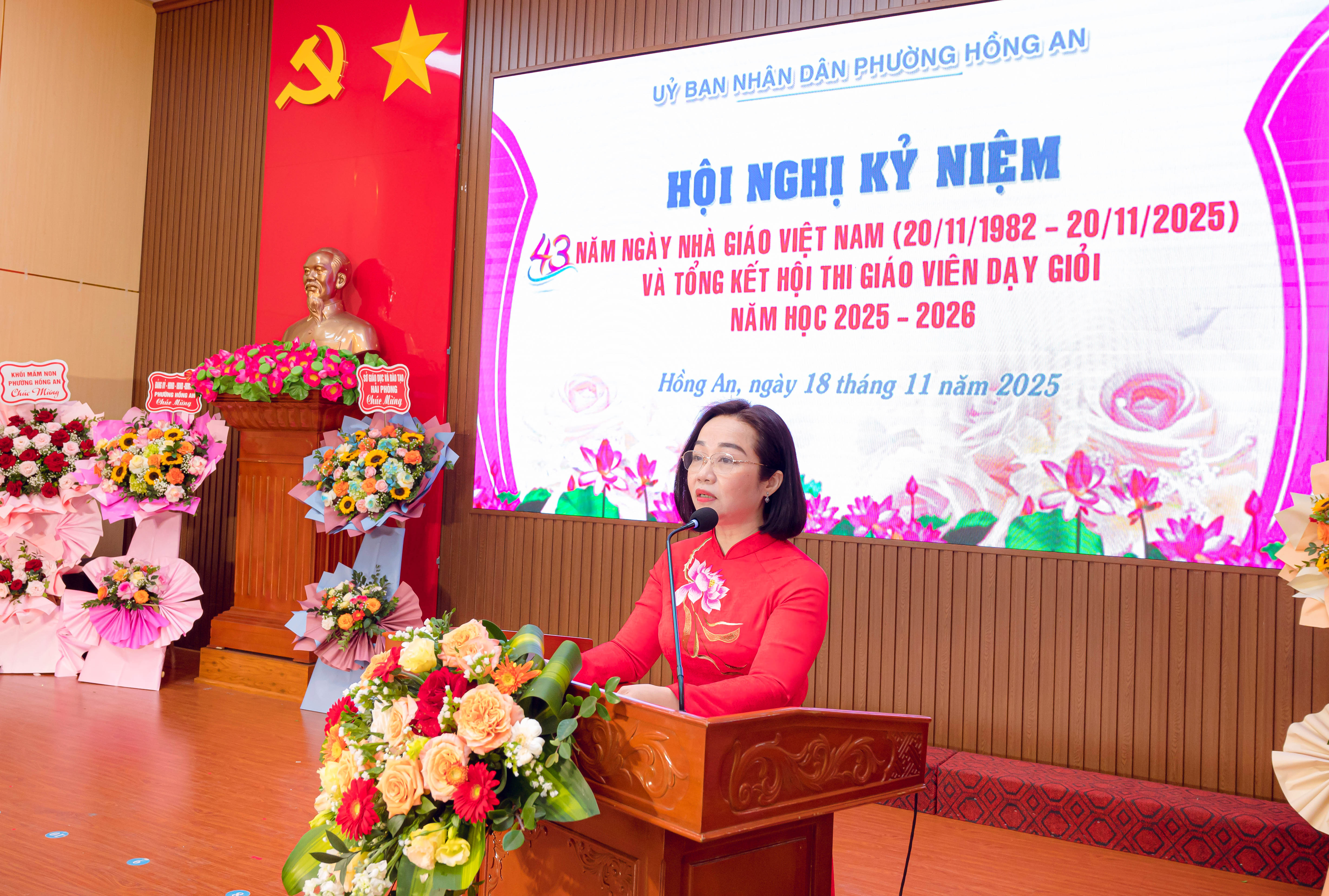 Đ/c Lê Thị Lan - Uỷ viên BTV Đảng uỷ, Phó Chủ tịch Thường trực UBND phường phát biểu ôn lại truyền thống 43 năm Ngày nhà giáo Việt Nam (20/11/1982 – 20/11/2025)Trong năm học vừa qua, các nhà trường trên địa bàn phường đã nỗ lực vượt khó, tiếp tục đổi mới công tác quản lý, nâng cao chất lượng dạy và học. Đội ngũ cán bộ, viên chức, giáo viên luôn phát huy tinh thần trách nhiệm, đoàn kết, sáng tạo, đạt nhiều kết quả nổi bật. Thông qua phong trào thi đua và các Hội nghị chuyên môn, nhiều tập thể, cá nhân đã vinh dự được các cấp khen thưởng: 03 cá nhân được tặng Bằng khen của Thủ tướng Chính phủ; 02 tập thể được nhận Bằng khen của Bộ trưởng Bộ Giáo dục và Đào tạo; 01 cá nhân được nhận Bằng khen của Trung ương Đoàn TNCS Hồ Chí Minh; 02 tập thể và 09 cá nhân được trao Giấy khen của Sở Giáo dục và Đào tạo. Những thành tích trên thể hiện sự nỗ lực bền bỉ của đội ngũ nhà giáo phường Hồng An, góp phần quan trọng vào kết quả giáo dục chung của địa phương.