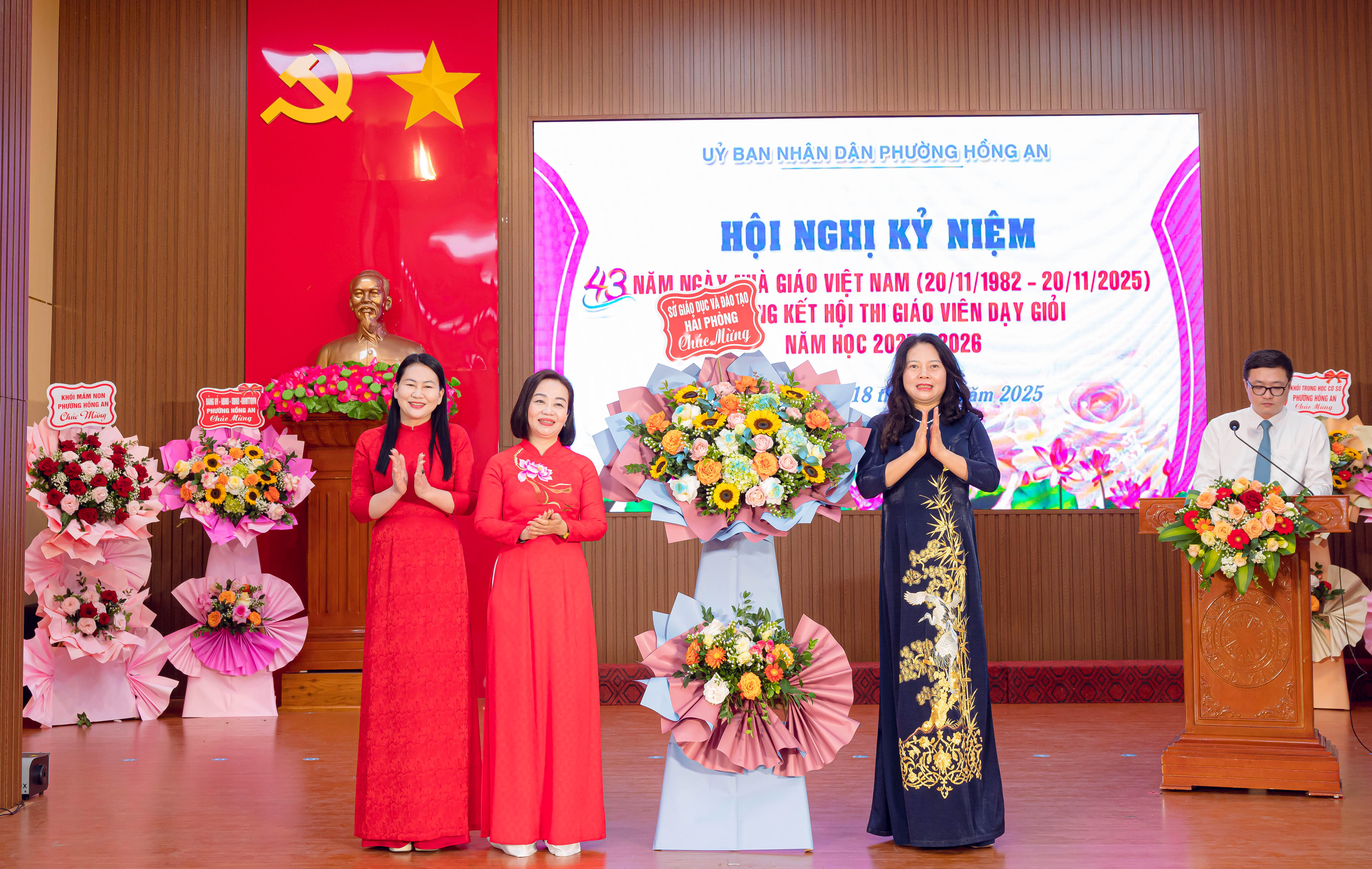 Đ/c Đỗ Việt Hưng - Bí thư Đảng uỷ, Chủ tịch HĐND phường tặng hoa chúc mừngTại Hội nghị, đồng chí Lê Thị Lan - Uỷ viên BTV Đảng uỷ, Phó Chủ tịch Thường trực UBND phường đã phát biểu ôn lại truyền thống 43 năm Ngày Nhà giáo Việt Nam, khẳng định đây là dịp để toàn xã hội tri ân công lao to lớn của các thế hệ nhà giáo – những người đã cống hiến thầm lặng nhưng bền bỉ cho sự nghiệp “trồng người”. Đồng chí nhấn mạnh ý nghĩa nhân văn, sâu sắc của ngày 20/11 trong đời sống xã hội; đồng thời bày tỏ sự biết ơn và trân trọng đối với đội ngũ cán bộ, giáo viên các nhà trường trên địa bàn phường, những người luôn giữ vững bản lĩnh nghề nghiệp, tâm huyết, sáng tạo, đi đầu trong đổi mới phương pháp giảng dạy, góp phần xây dựng nền giáo dục Hồng An ngày càng phát triển.
