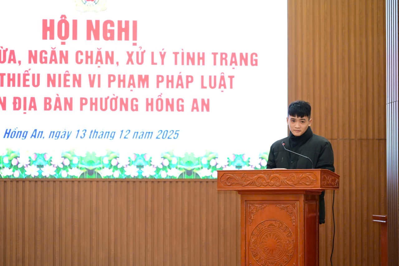 Đại diện thanh niên phường Hồng An phát biểuTại hội nghị, Công an phường triển khai Kế hoạch phòng ngừa, ngăn chặn, trấn áp, xử lý tình trạng thanh thiếu niên tụ tập gây mất ANTT trên địa bàn phường nhằm ngăn chặn kịp thời các loại tội phạm như: cướp tài sản, cướp giật tài sản, gây rối TTCC, cố ý gây thương tích, đặc biệt xử lý nghiêm tình trạng thanh, thiếu niên đua xe trái phép, góp phần giữ vững ANTT, bảo vệ tính mạng, tài sản của Nhân dân, tạo đà xây dựng phường Hồng An an toàn, văn minh.