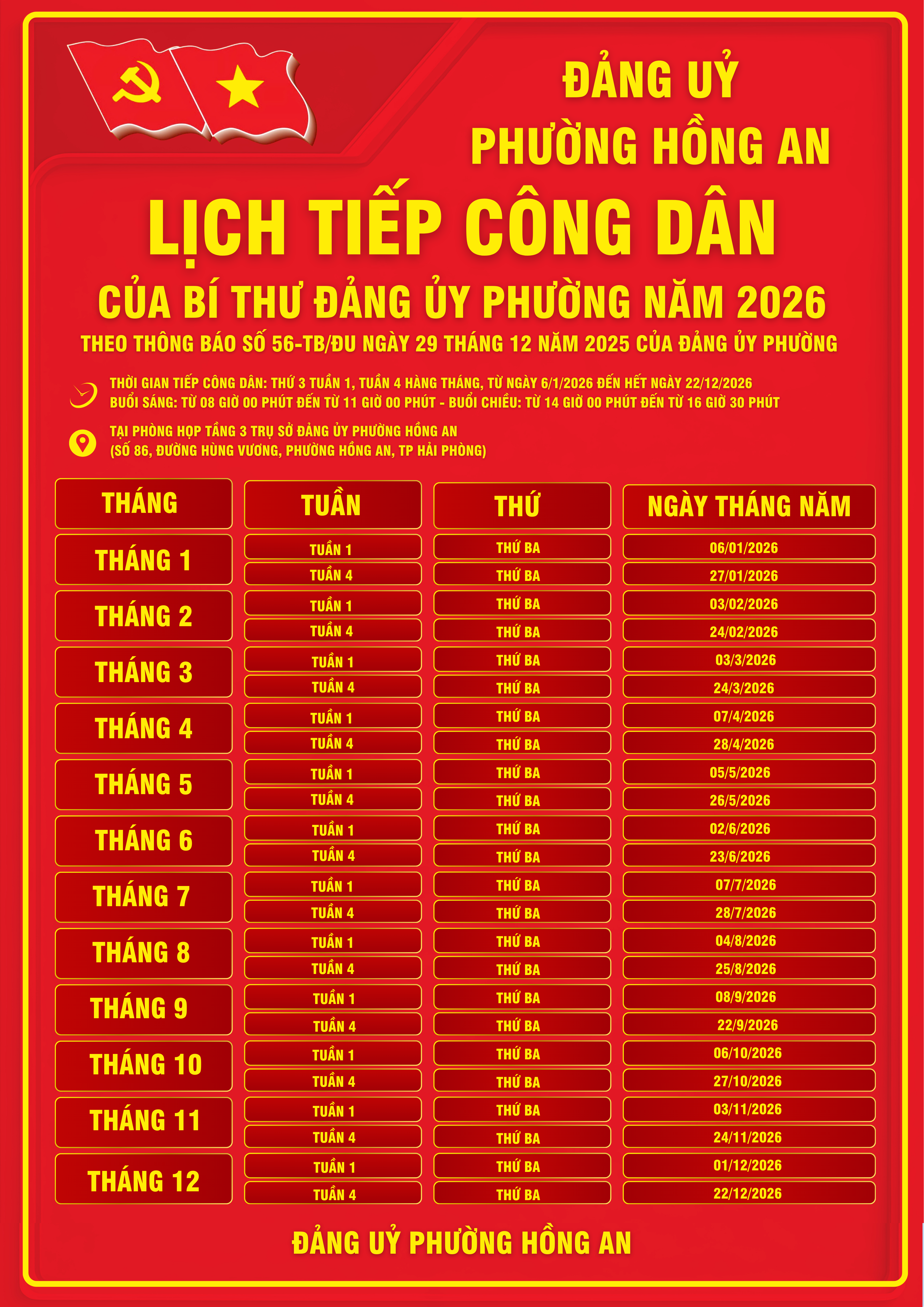 Thông báo lịch tiếp công dân của Bí thư Đảng uỷ phường Hồng An năm 2026