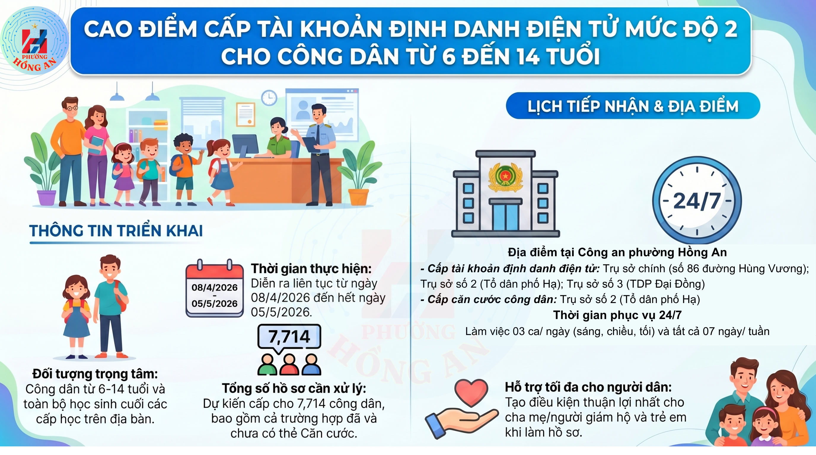 Công an phường Hồng An triển khai đợt cao điểm cấp tài khoản định danh điện tử mức độ 2 cho công dân từ 6 đến 14 tuổi