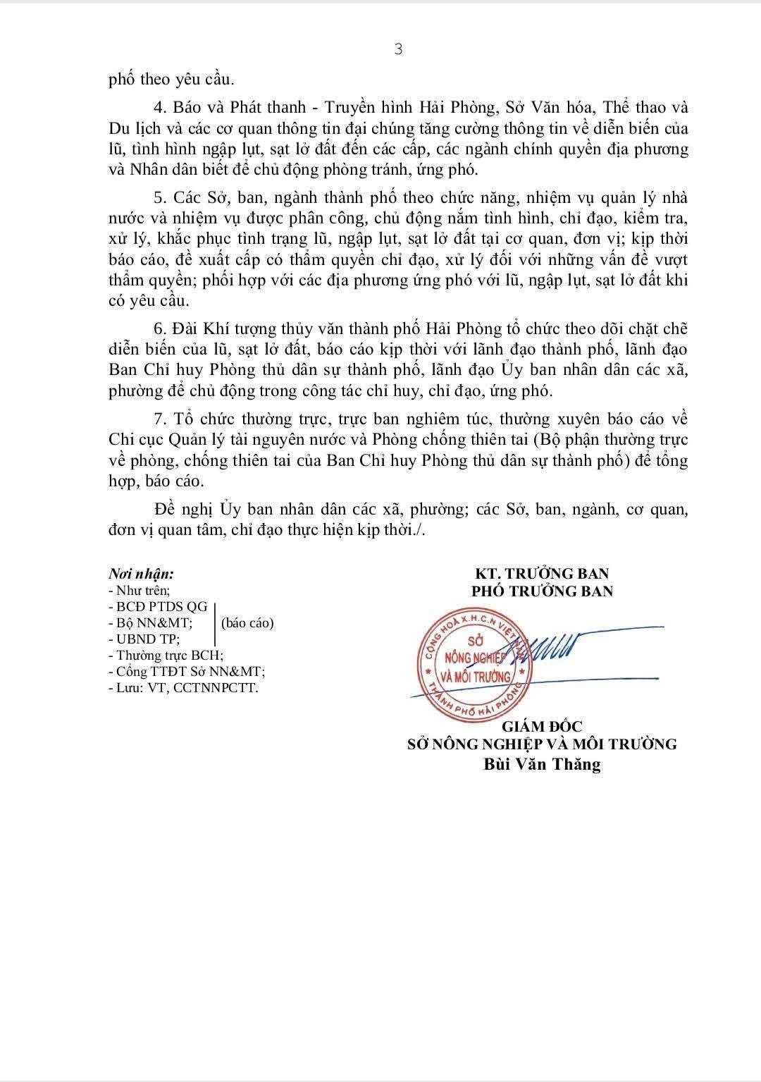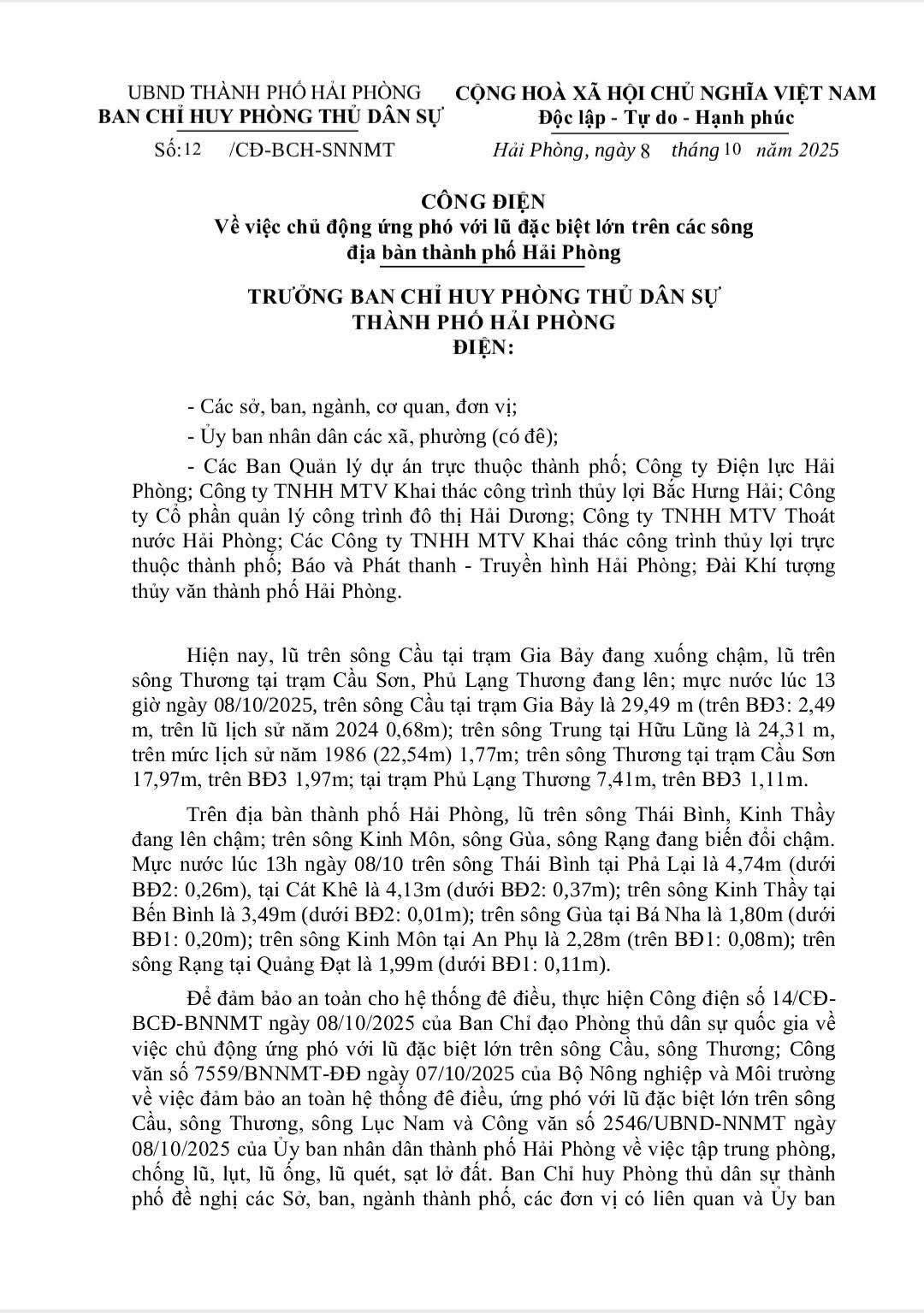 CÔNG ĐIỆN VỀ VIỆC CHỦ ĐỘNG ỨNG PHÓ VỚI LŨ ĐẶC BIỆT LỚN TRÊN CÁC SÔNG ĐỊA BÀN TP HẢI PHÒNG