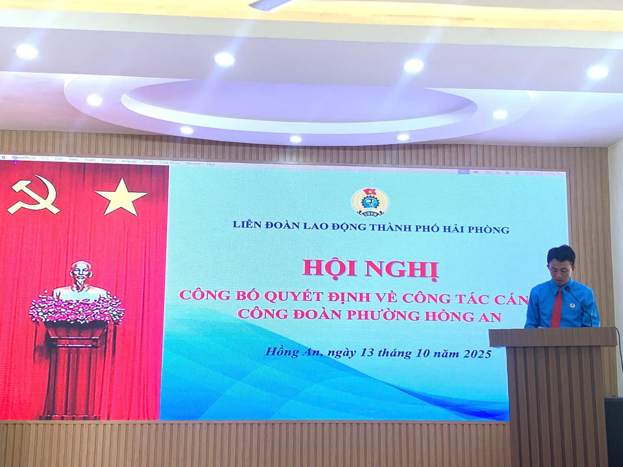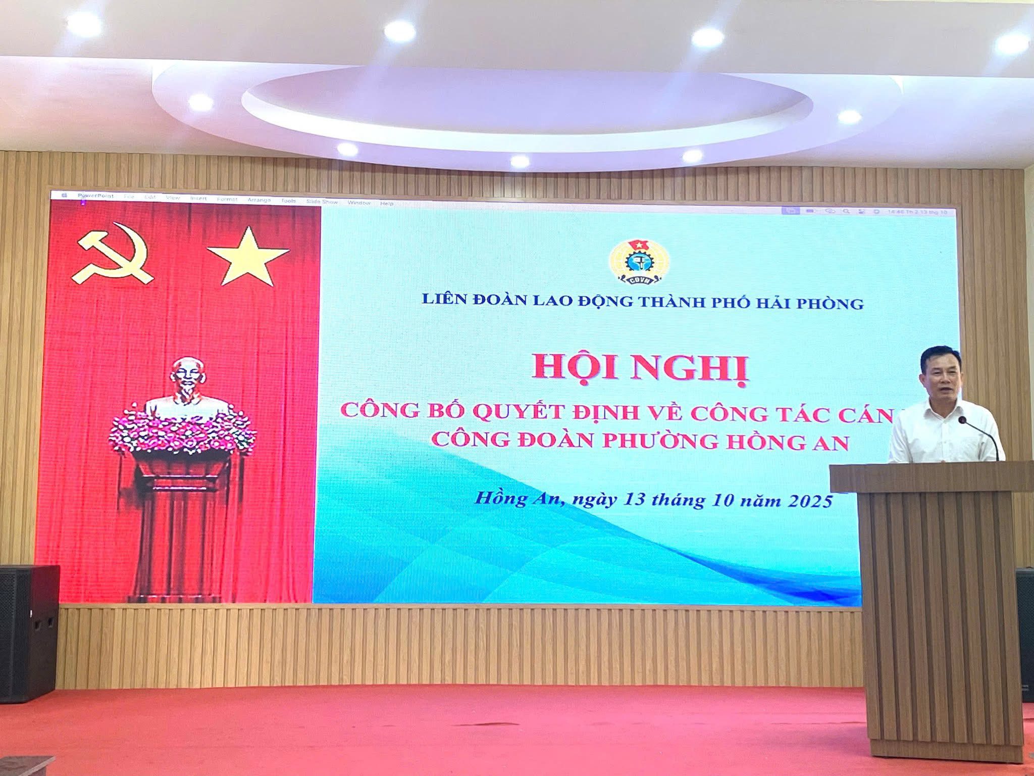 Chiều ngày 13/10/2025, Liên đoàn Lao động thành phố Hải Phòng tổ chức Hội nghị công bố Quyết định về công tác cán bộ Công đoàn phường Hồng An, nhiệm kỳ 2025 - 2030. Dự hội nghị có các đồng chí: Nguyễn Văn Phiệt - Phó Chủ tịch Liên đoàn Lao động thành phố; Đặng Đức Hiền - Ủy viên Ban Thường vụ, Phó Trưởng Ban Công tác Công đoàn, Trưởng bộ phận Tổ chức - Kiểm tra Liên đoàn Lao động thành phố. Về phía phường Hồng An có đồng chí Lê Văn Mịch - Phó Bí thư Thường trực Đảng ủy phường; cùng các đồng chí Uỷ viên Ban Thường vụ Đảng ủy, Ủy ban MTTQ Việt Nam phường và các tổ chức chính trị - xã hội.