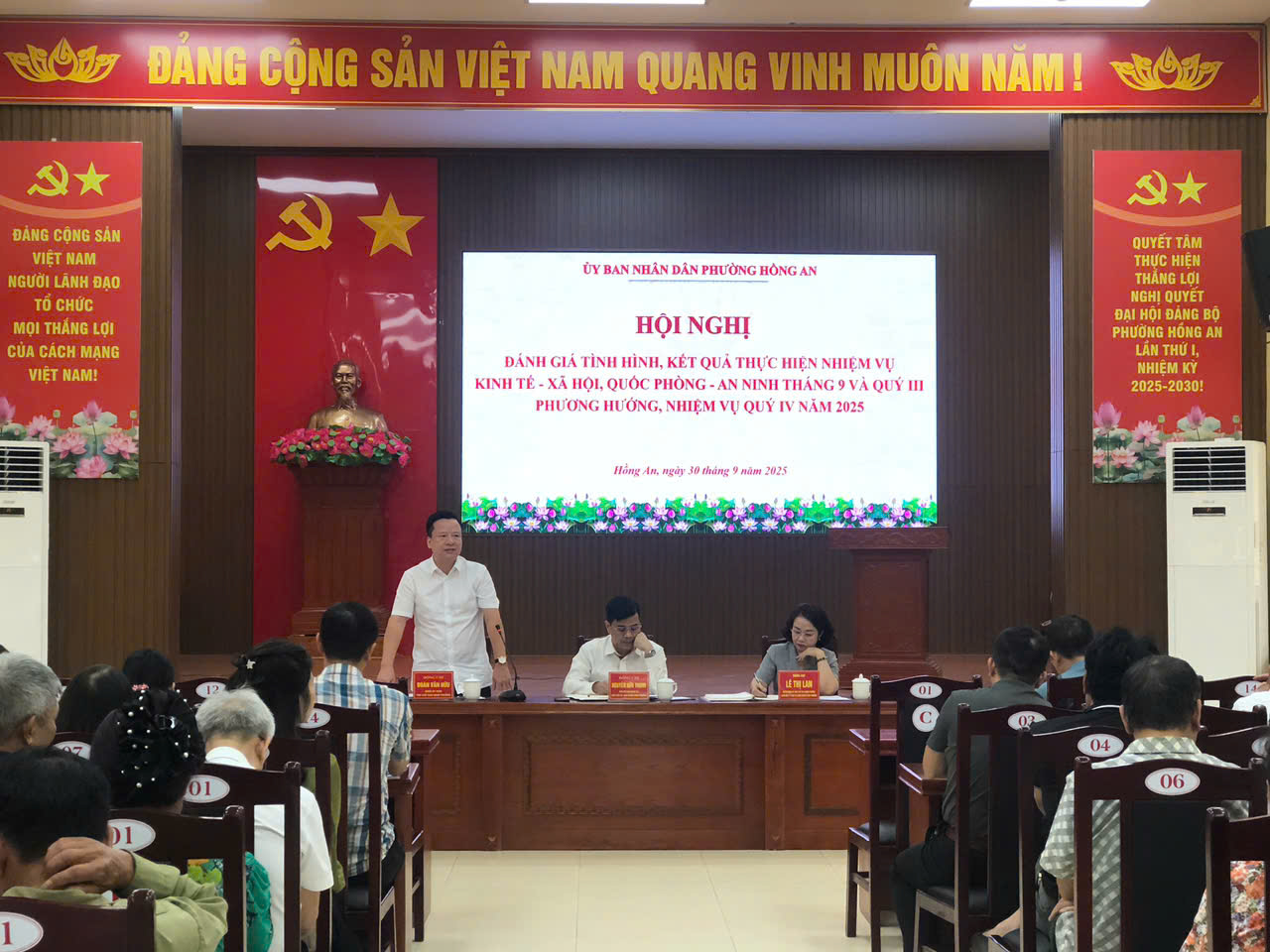 Ngày 30/9/2025, tại Nhà văn hoá phường, UBND phường Hồng An tổ chức Hội nghị đánh giá tình hình thực hiện nhiệm vụ kinh tế- xã hội, quốc phòng – an ninh tháng 9 và quý III/2025, phương hướng nhiệm vụ quý IV.