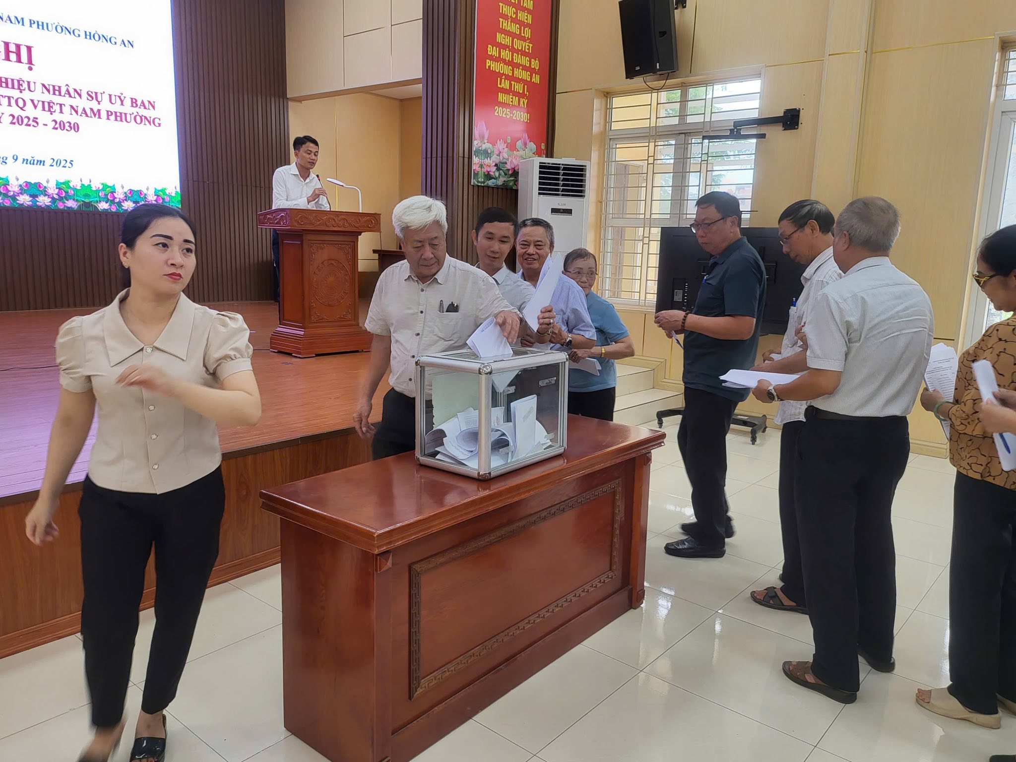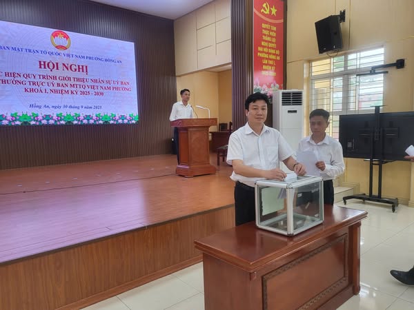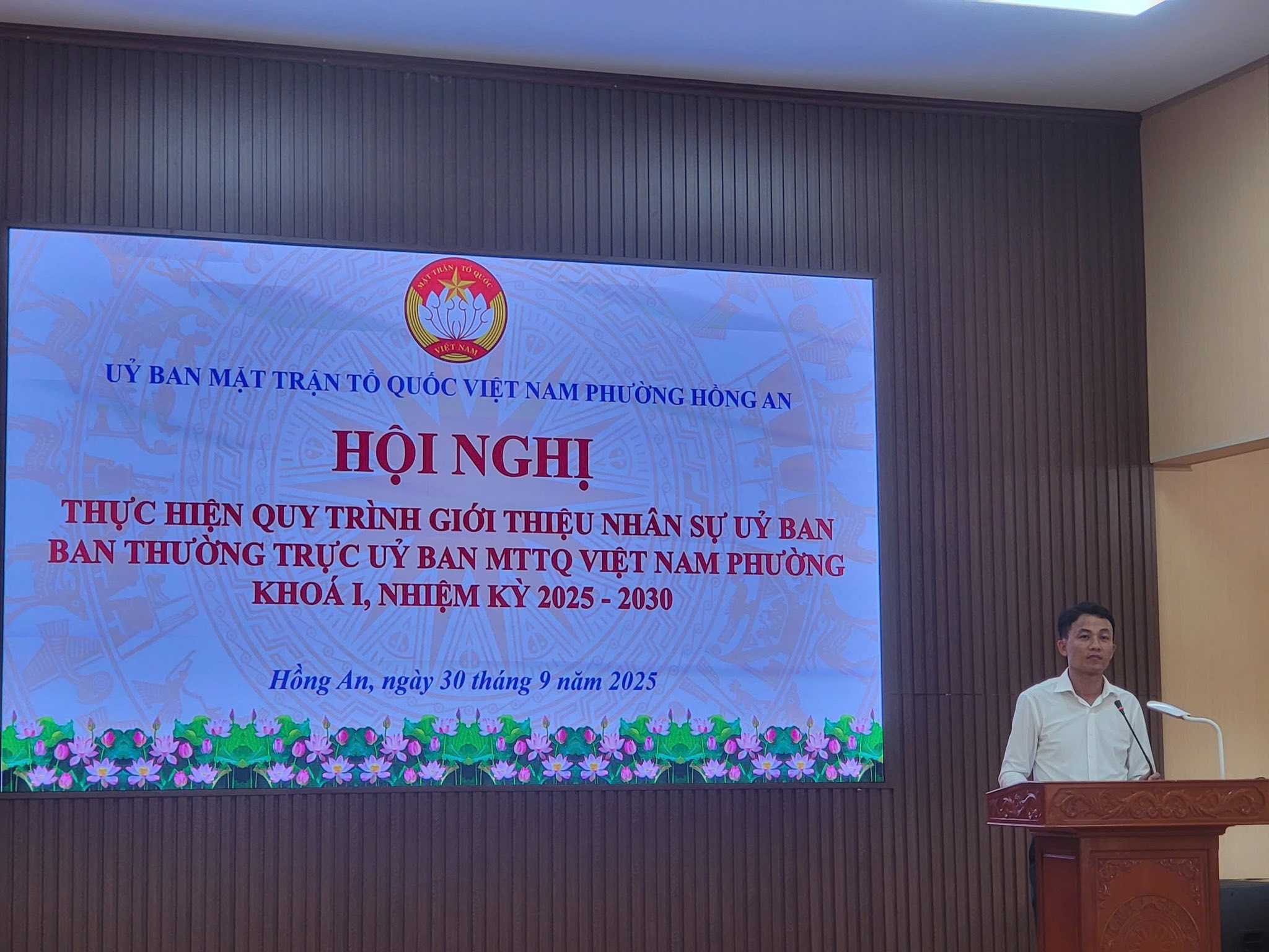 Thực hiện các văn bản chỉ đạo, hướng dẫn của Trung ương, Thành ủy, Ủy ban MTTQ Việt Nam thành phố Hải Phòng và Đảng ủy phường Hồng An về công tác chuẩn bị nhân sự Đại hội MTTQ các cấp; sáng ngày 30/9/2025, tại hội trường phường Hồng An, Ủy ban Mặt trận Tổ quốc Việt Nam phường đã long trọng tổ chức Hội nghị thực hiện quy trình giới thiệu nhân sự Ủy ban và Ban Thường trực Ủy ban MTTQ phường khóa I, nhiệm kỳ 2025 – 2030.
