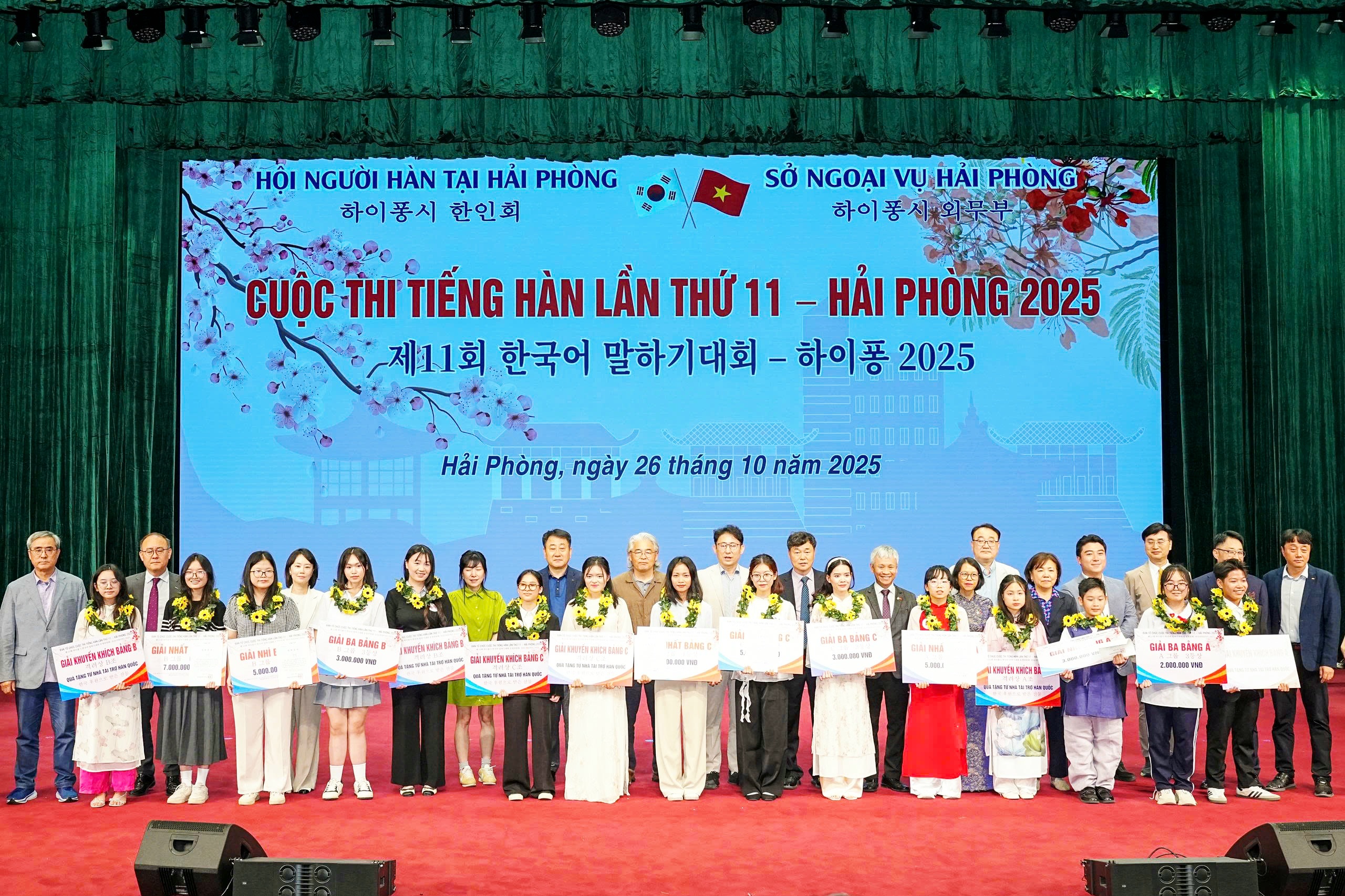 Trước đó vào chiều ngày 26/10/2025, cuộc thi Tiếng Hàn lần thứ XI – Hải Phòng 2025 do Trung tâm Văn hoá Việt – Hàn phối hợp tổ chức đã thu hút gần 300 thí sinh đến từ 30 trường học và doanh nghiệp trên địa bàn thành phố. Trải qua các vòng thi viết và phỏng vấn trực tiếp với giám khảo người Hàn Quốc, Ban tổ chức đã lựa chọn được 15 thí sinh xuất sắc nhất ở ba bảng thi: Tiểu học – THPT – Đại học và người đi làm bước vào vòng chung kết đầy kịch tính và hấp dẫn.